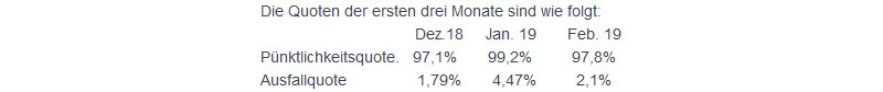 Deutsche Eisenbahn Service AG: 100 Tage HANS in der Altmark100 Tage Elbe-Altmark-Netz: Im Auftrag der Länder Sachsen-Anhalt und Brandenburg fährt die HANSeatische Eisenbahn GmbH (kurz HANS) seit 100 Tagen auf den Linien RB 33 Stendal – Tangermünde und RB 34 Stendal – Rathenow und blickt auf herausfordernde, aber auch erfüllende drei Monate zurück.Der positive Eindruck eines erfolgreichen Starts am 9. Dezember 2018, der ohne Probleme und mit zufriedenen Fahrgästen erfolgte, wurde kurz danach leider von einigen unvorhergesehenen Zugausfällen ein wenig getrübt. Mittlerweile hat sich die Situation entspannt und die HANSeatische Eisenbahn hat ihre Betriebsroutine gefunden. „Unsere jahrelange Erfahrung bei der Übernahme von Regionalverkehrsleistungen von anderen Unternehmen zeigen, dass trotz intensiver Vorbereitung und viel Engagement unserer Mitarbeiter im Vorfeld nie ganz ausgeschlossen werden kann, dass zum Betriebsstart noch nicht alles optimal und rund läuft. Wir haben die relevanten Stellschrauben jedoch schnell erkannt und nachjustiert“, zieht Dr. Ralf Böhme, Geschäftsführer der HANS, eine erste Bilanz. Fahrzeugsituation fordert Lösungen Die auf der RB 33 und RB 34 eingesetzten LINT-Fahrzeuge sind gebraucht übernommen. Der Vorbesitzer übergab diese erst kurz vor Betriebsstart. „Bei der Einbindung der Fahrzeuge in das Betriebs- und Instandhaltungsregime der HANS mussten wir daher pragmatische Lösungen finden. Einige fahrzeugbedingte Zugausfälle im Dezember und Januar ließen sich jedoch nicht ganz vermeiden“, so Böhme weiter. Zurzeit befindet sich ein LINT-Fahrzeug in der Werkstatt zum Achstausch. Zur Kompensation wird ein Fahrzeug vom Typ RegioShuttle eingesetzt. Personalsituation entspannt sich Passendes Personal im Bahnbereich zu finden, gestaltet sich aktuell für viele Eisenbahnverkehrsunternehmen schwer. Die HANS hatte jedoch von Anfang an nahezu alle Dienstschichten planmäßig besetzen können, auch mit Hilfe der bisherigen Stammpersonale aus der Prignitz. Seit Februar sind alle offenen Stellen besetzt. „Unser Team aus Triebfahrzeugführern und Kundenbetreuern ist sehr engagiert, kompetent, freundlich und agiert mit einer tollen Außenwirkung“, stellt Böhme erfreut fest und formuliert so auch sein Anforderungsniveau an die eingesetzten Personale. Pünktlichkeits- und Ausfallquote Monatlich erfasst die HANS seine Pünktlichkeits- und Ausfallquote für die Strecken der RB 33 und RB 34. Die Pünktlichkeitsquote zeigt auf, zu wieviel Prozent die Halte pünktlich angefahren wurden. Als pünktlich in diesem Sinne gelten alle Fahrten, die nicht später als 5 min die Halte erreichen. Die Ausfallquote zeigt auf, wie viele Züge in einem Zeitraum nicht gefahren sind.
