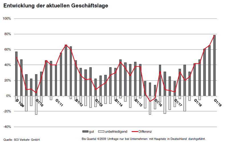 Die Bewertung der aktuellen Marktlage durch die Top-Manager der Bahnbranche macht erneut einen kräftigen Sprung nach oben, was insbesondere an einem weiteren Zugewinn an positiven Einschätzungen liegt. Der ermittelte Wert wurde durch die gute Marktsituation zu Beginn des Jahres 2019 weiter beflügelt und erreicht das höchste Niveau der vergangenen zehn Jahre. Weiterhin bewertete keiner der Befragten die aktuelle Situation als „unbefriedigend“, was die positive Entwicklung zusätzlich unterstreicht.