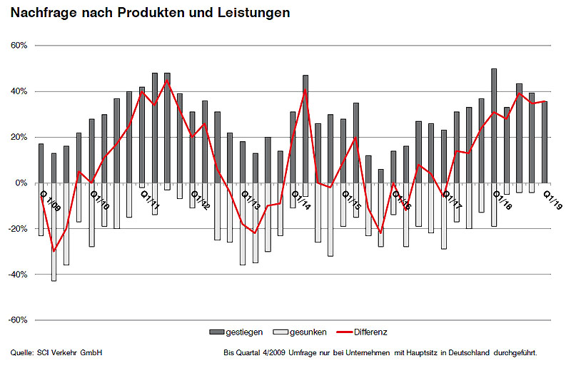 Der sich aus Nachfrage nach Produkten und Dienstleitungen ergebende Index konnte im Vergleich zum letzten Quartal wieder leicht zulegen. Obwohl die Anzahl der Befragten mit Angabe von gestiegener Nachfrage nach Produkten und Dienstleistungen leicht rückläufig ist, stieg die Differenz aus positiven und negativen Antworten leicht an. Dies liegt vor allem an der Besonderheit, dass keiner der Top-Manager eine gesunkene Nachfrage in diesem Quartal angegeben hat.