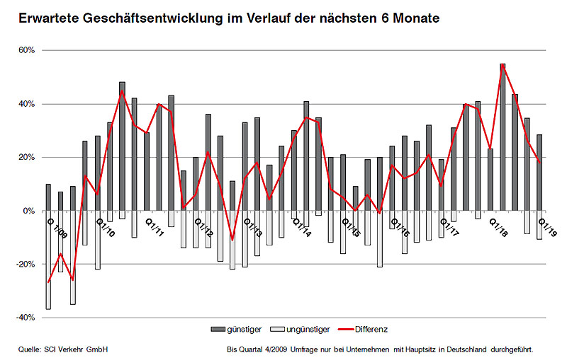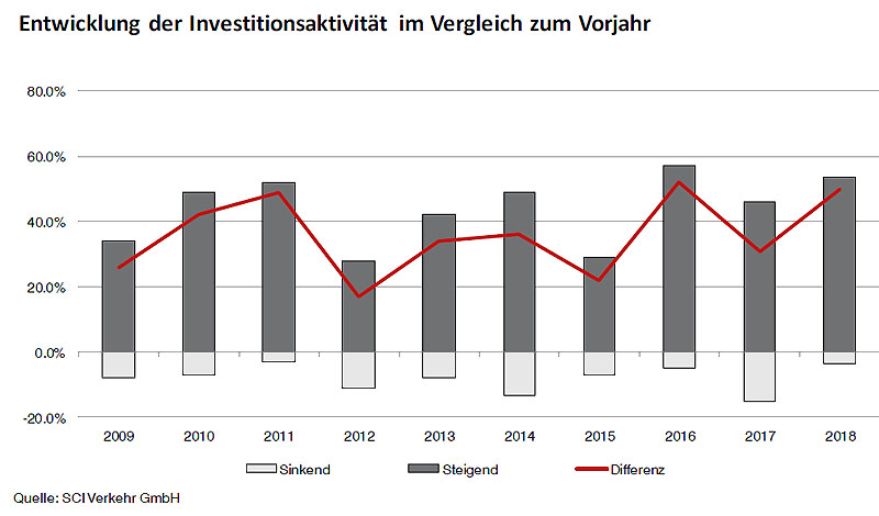Seit vielen Jahren befragt SCI Verkehr die Unternehmen der globalen Bahnindustrie zur Entwicklung ihrer Investitionsaktivitäten im Vergleich zum Vorjahr. Verglichen mit dem Jahr 2017, stieg der dargestellte Saldo der Investitionsaktivitäten im vergangenen Jahr 2018 wieder an. Dabei gab ein Anteil von knapp 54% der befragten Top-Manager steigende Investitionen im Vergleich zum Vorjahr an. Dagegen stehen lediglich 4% der befragten Teilnehmer, die sinkende Investitionen im Jahr 2018 angaben. Dieser wieder deutlich homogenere Eindruck führt schließlich zu einer steigenden Gesamtentwicklung im Vergleich zum Stimmungsbild des Jahres 2017. Legende: Der SCI GLOBAL RAIL INDEX basiert auf ca. 100 Meldungen von repräsentativen Unternehmen aus der weltweiten Bahnbranche. Die Unternehmen werden regelmäßig gebeten, ihre gegenwärtige Geschäftslage zu beurteilen und ihre Erwartungen für die kommenden sechs Monate mitzuteilen. Sie können ihre Lage mit gut, befriedigend oder schlecht und ihre Geschäftserwartungen für die kommenden sechs Monaten als günstiger, gleich bleibend oder ungünstiger kennzeichnen. Der Saldowert der gegenwärtigen Geschäftslage ist die Differenz der Prozentanteile der Antworten gut und schlecht, der Saldowert der Erwartungen ist die Differenz der Prozentanteile der Antworten günstiger und ungünstiger. Das Geschäftsklima ist ein transformierter Mittelwert aus den Salden der Geschäftslage und der Erwartungen. Quelle:/Fotos: SCI Verkehr GmbH | |