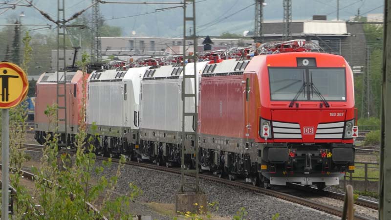 185 197-1 ist mit drei neuen DB-Vectrons in Richtung Norden unterwegs: 193 365-4, 193 367--0 und 193 368-8. Göttingen, 26.04.2019