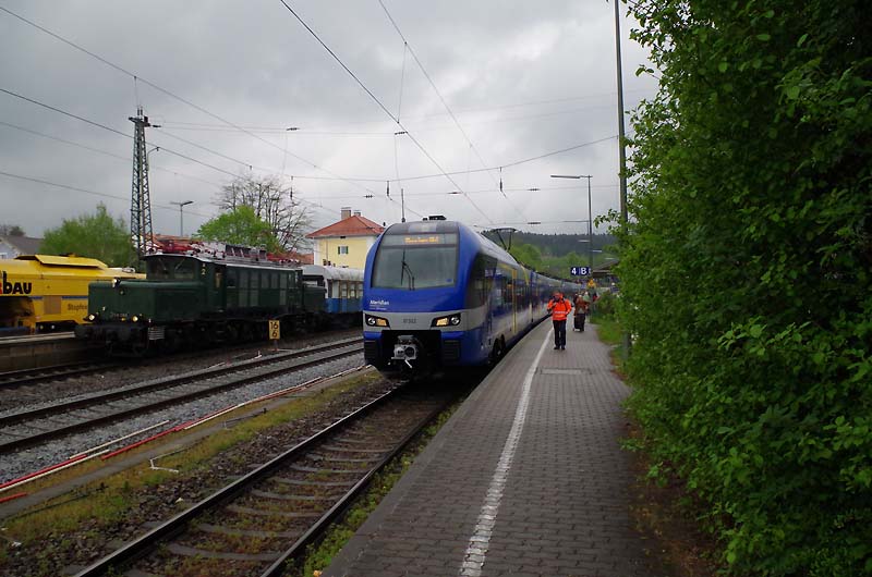 Da die Baustelle seit dem Wochenende im Richtungsgleis München ist, kann von Personenzügen nur Gleis 4 (normalerweise Ri. Salzburg) angefahren werden. Hier der FLIRT ET 322 des Meridian nach München Hbf. bei der Überholung des Überführungszuges mit E 94 088 in Gleis 1. Die Baustelle machte das rangieren aus Gleis 1 möglich, da auf Gleis 2 derzeit wegen der Weichenanordnung in Endorf nur Baustellenverkehr geht. Im Gegenzug ist übrigens vorletzten Samstag ein Beiwagen zum MAN Schienenbus aus Bonn in Obing angekommen. Den hat der LEO dort aus einer Insolvenz erstanden und auf eigenem Rad als Anhängsel an div. Güterzüge im Ping Pong via Passau, Straubing, Regensburg und Landshut nach Bad Endorf überführt (die letzte Etappe an einem der Bauzüge die hier mehrmals tgl. vorbeikommen. Wo ein Wille ist ist auch eine Trasse). Quelle:/Fotos: Holger Fuhr | |