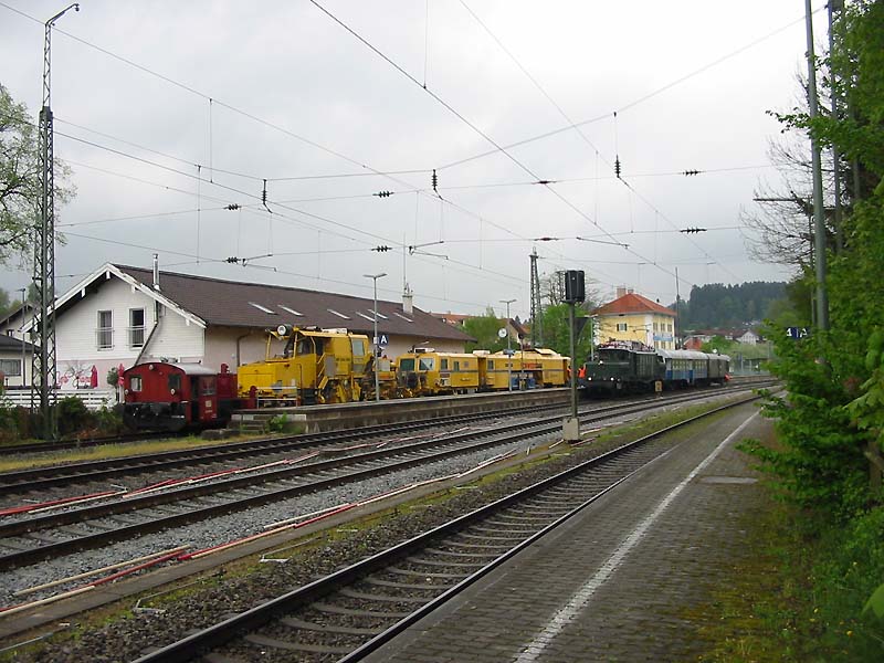 Die Museumsbahn Bad Endorf - Obing (LEO) hat im Rahmen einer Fuhrparkbereinigung einen alten Umbauwagen nach Münsingen abgegeben. Abgeholt wurde der Wagen von E 94 088 der EZW aus Stuttgart ! Hier ist der kurze Zug Abfahrbereit in Bad Endorf am 29.04. gegen 14 Uhr. Am LEO Gleis 1 die Köf des LEO und zwei Gleisbaumaschinen, die auf ihren Einsatz in der Baustelle die derzeit zwischen Endorf und Prien ist, warten.