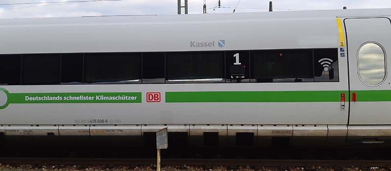 Folgende ICE-Triebköpfe wurden bereits mit grünem Streifen gesichtet (mit Belegaufnahme): Tz 1106 'Erfurt' am 26.11.2019 (mit 411 504 und 006) Tz 1112 'Freie Hansestadt Hamburg' am 30.11.2019 Tz 1118 'Plauen/Vogtland' am 20.11.2019 Tz 1131 'Trier' am 19.11.2019 Tz 1132 'Wittenberge' am 29.11.2019 Tz 1163 'Ostseebad Binz' am 20.11.2019 Tz 1165 'Bad Oeynhausen`, 28.11.2019 Tz 1167 'Traunstein' am 22.11.2019 Tz 1168 'Ellwangen' am 24.11.2019 Tz 1180 'Darmstadt' am 25.11.2019. Tz 1183 'Oberursel/Ts' am 23.11.2019 Tz 1504 'Heidelberg' am 28.11.2019 - nicht vollständig beklebt! Tz 1506 'Kassel' am 03.12.2019 Tz 1523 'Hansastadt Greifswald' am 19.11.2019 Tz 1581 ''Horb an Neckar' am 27.11.2019 (mit 411 081 und 411 505) Quelle:/Fotos: Lok-Vogel Redaktion | |
