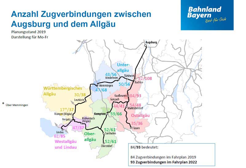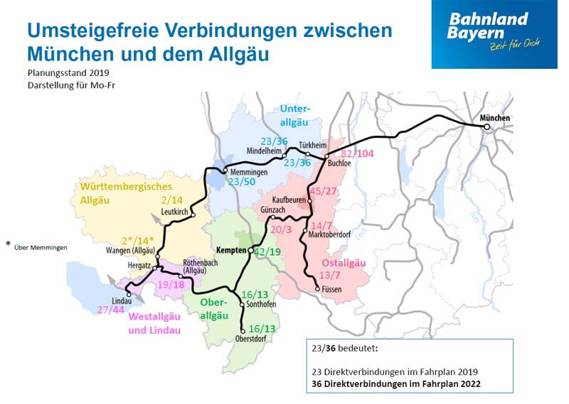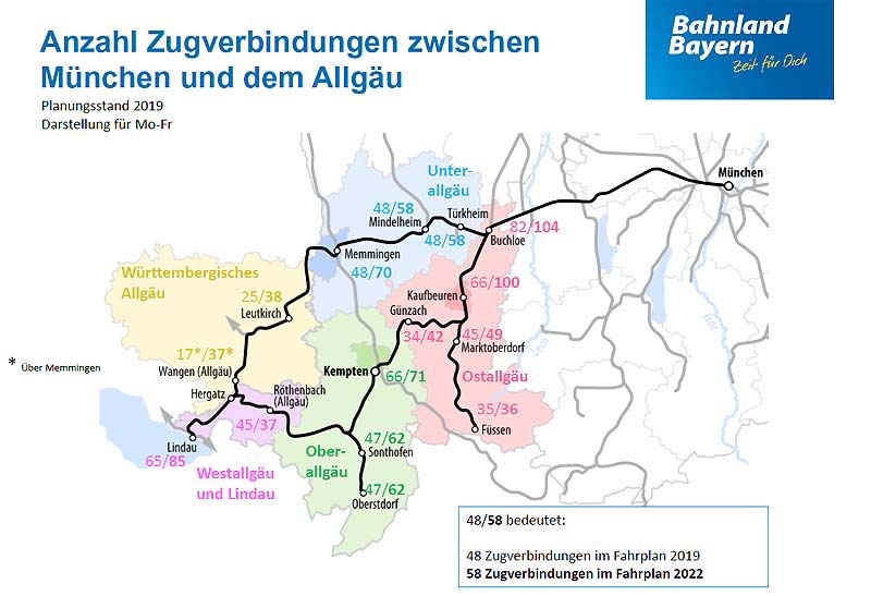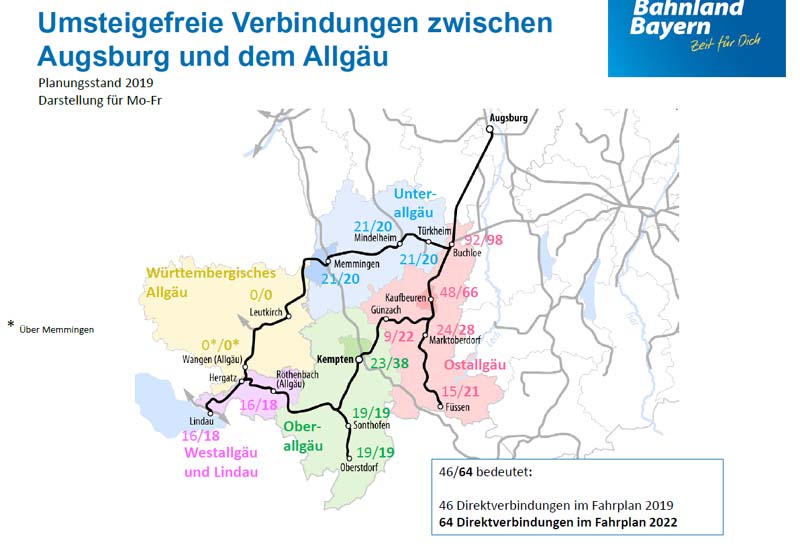 BEG informiert über Fahrplanentwicklung und Fahrzeugkonzepte im AllgäuMÜNCHEN. Im Rahmen von drei Informationsveranstaltungen in Kaufbeuren, Lindau und Kempten hat die Bayerische Eisenbahngesellschaft (BEG) in den vergangenen Wochen Mandatsträger und Vertreter von Fahrgastverbänden und -initiativen aus dem Allgäu über die Weiterentwicklung des Schienenpersonennahverkehrs in der Region informiert. Die BEG plant, finanziert und kontrolliert im Auftrag des Freistaats den Regional- und S-Bahn-Verkehr in Bayern. Schwerpunktthemen waren der künftige Fahrplan sowie der geplante Fahrzeugeinsatz. „In den vergangenen Monaten haben wir in diversen Gesprächen festgestellt, dass es im Allgäu erheblichen Klärungsbedarf zum künftigen Angebot im Regionalverkehr gibt“, sagt Bärbel Fuchs, Geschäftsführerin der BEG. „Um offene Fragen zu klären, haben wir daher das Gespräch mit Mandatsträgern und Fahrgastvertretern aus der Region gesucht.“ Elektrifizierung der Strecke München – Memmingen – Lindau Ausgangspunkt für die umfangreichen Änderungen am Fahrplan im Allgäu ist die Elektrifizierung der Strecke (München –) Geltendorf – Memmingen – Lindau, die Ende 2020 abgeschlossen sein wird. „Die Elektrifizierung der Strecke München – Lindau bringt einen großen Mehrwert für Schwaben und das Allgäu. Die Fahrtzeit verkürzt sich deutlich und wir bauen gleichzeitig das Angebot aus. Neben einer neuen Expresslinie von München nach Memmingen wird es auch wieder direkte Verbindungen von München Richtung Unterallgäu und Bodensee über Memmingen geben“, so der Bayerische Verkehrsminister Dr. Hans Reichhart. Ziel des Ausbaus der Strecke durch den Bund ist es, die Fahrzeit im dann zweistündlich angebotenen Fernverkehr zwischen München und Zürich auf unter drei Stunden und 30 Minuten zu verkürzen. Auch der Regionalverkehr zwischen München, Memmingen und Lindau, der bisher mit dieselbetriebenen Fahrzeugen gefahren wird, soll aus ökologischen und wirtschaftlichen Gründen nach Fertigstellung des Ausbaus elektrisch betrieben werden. Diese Verkehrsleistungen im künftigen E-Netz Allgäu hatte die BEG gemeinsam mit Baden-Württemberg daher 2017 europaweit ausgeschrieben. Den Zuschlag erhielt das Verkehrsunternehmen Go-Ahead, das ab Ende 2021 nach Vorgaben der BEG mit spurtstarken Elektrotriebwagen und einem deutlich erweiterten und beschleunigten Angebot sowie mehr Direktverbindungen auf der elektrifizierten Strecke startet. Fahrgäste können dann z. B. jede zweite Stunde eine neue schnelle Regionalzugverbindung zwischen München und Memmingen nutzen, deren Fahrzeit sich gegenüber dem heutigen Regionalzugangebot um etwa eine halbe Stunde verkürzt. Zwischen Memmingen und Lindau weitet die BEG das Angebot auf einen Stundentakt aus. Zudem gibt es künftig im Regionalverkehr zweistündlich Direktverbindungen von München ins Württembergische Allgäu, zum Beispiel nach Leutkirch und Wangen. Bereits vor den großen Veränderungen ab Ende 2021 profitiert das Allgäu von Verbesserungen im Fahrplan im Rahmen eines Sonderprogramms des Freistaats, das in ganz Bayern den Stundentakt herstellen soll: Ab Juni 2020 weitet die BEG in der Region auf der Strecke Kaufbeuren – Füssen das Angebot frühmorgens und spätabends aus. Ost- und Oberallgäu: insgesamt mehr Verbindungen, teilweise aber mit Umstieg in Buchloe / Wichtige Direktverbindungen nach München bleiben bestehen Das nicht elektrifizierte Ober- und Ostallgäu inklusive der kreisfreien Städte Kempten und Kaufbeuren hatten im Vorfeld Bedenken geäußert, nach der Fertigstellung der Elektrifizierung schlechter an die Landeshauptstadt angebunden zu sein. Stefan Bosse, Oberbürgermeister von Kaufbeuren und Vorsitzender des Regionalen Planungsverbands Allgäu erklärt: „Wir haben durch die Informationsveranstaltungen der BEG ein gemeinsames Verständnis entwickelt, was derzeit machbar und ökologisch ist. Wir werden uns weiterhin für die Elektrifizierung weiterer Allgäuer Strecken einsetzen, sodass sich langfristig die Anzahl der Direktverbindungen Richtung München wieder erhöht.“ Fuchs begründet die Änderungen am Fahrplankonzept: „Es ist weder ökologisch noch wirtschaftlich vertretbar, dass wir eine unverändert hohe Anzahl an dieselbetriebenen Zügen aus dem südlichen Allgäu auf der frisch elektrifizierten Strecke nach München fahren lassen. Das wäre absurd. Die Devise lautet: So wenig wie möglich ‚Diesel‘ unter Fahrdraht, aber weiterhin Direktverbindungen in die Landeshauptstadt aus allen Teilen des Allgäus. Zwischen diesen beiden Zielen mussten wir einen Kompromiss finden.“ Deshalb reduziert die BEG im neuen Fahrplankonzept ab Ende 2021 teilweise die Zahl der umsteigefreien Verbindungen aus dem Ober- und Ostallgäu nach München. Das heißt, die Fahrgäste müssen künftig öfter in Buchloe umsteigen. Aber: Wichtige Direktverbindungen aus dem südlichen Allgäu nach München bleiben bestehen. Und: Die Zahl der Verbindungen insgesamt nach München erhöht sich meist sogar. Zwischen Lindau, Oberstdorf, Immenstadt, Kempten und Buchloe profitieren die Fahrgäste von einem Stundentakt. Diese Verkehre erbringt DB Regio mit dieselbetriebenen Neigetechnikzügen vom Typ VT612. Ab Buchloe fahren die Züge jede Stunde abwechselnd entweder direkt nach München oder Augsburg weiter. In den Zwischenstunden müssen die Fahrgäste entweder Richtung München oder Augsburg umsteigen. Damit sind München und Augsburg aus dem Oberallgäu weiterhin stündlich schnell erreichbar, Direktverbindungen nach München gibt es jede zweite Stunde. Zwischen Füssen und Buchloe können Fahrgäste mit der Bayerischen Regiobahn stündlich reisen. Die meisten Züge aus Füssen verkehren direkt weiter nach Augsburg. In diesen Fällen bestehen in Buchloe kurze Umsteigezeiten in die elektrisch betriebenen Züge nach München. Es wird aber auch aus Richtung Füssen über den ganzen Tag verteilt weiterhin einzelne Direktverbindungen nach M
