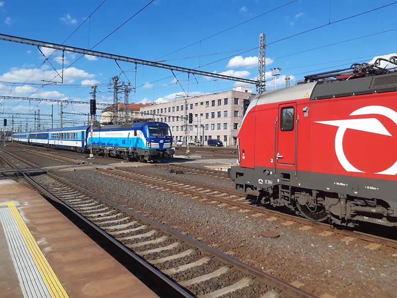, das durch eine rote slowakische ZSSK-Lokomotive (91 56 6383 102-1 SK-RAILL) ersetzt wurde. Um 17:44 Uhr nahm sie den EC-Zug 283 Metropolitan Slovenská strela von Prag nach Bratislava.