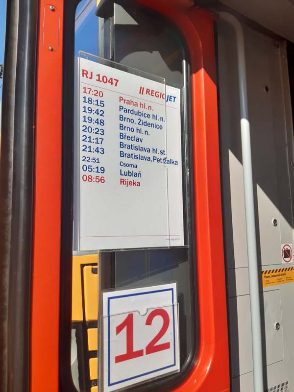 Sie verkehren auf der Strecke Prag - Pardubice - Brno - Bratislava - Csorna - Ljubljana - Rijeka. Die Züge haben 12 Wagen, von denen 8 Liegewagen sind, und die Kapazität des gesamten Zuges betrug ungefähr 560 Sitzplätze. Der Preis für ein Ticket in Sitzwagen beträgt ab 590 CZK / 22 Euro und in den Liegenwagen ab 790 CZK / 30 Euro. RegioJet kooperiert beim Betrieb der Zugverbindungen Prag - Rijeka mit der kroatischen Eisenbahn HZ, der slowenischen Eisenbahn SZ und der ungarischen Firma Continental Railway Solution. Der erste Zug fuhr mit einer Vectron-Lokomotive in den gelben Farben von RegioJet von Prag ab. Kroatien ist ein sehr beliebtes Touristenziel für die Tschechische Republik. Von Rijeka gibt es Bustransfers zu touristischen Orten an der Adriaküste.