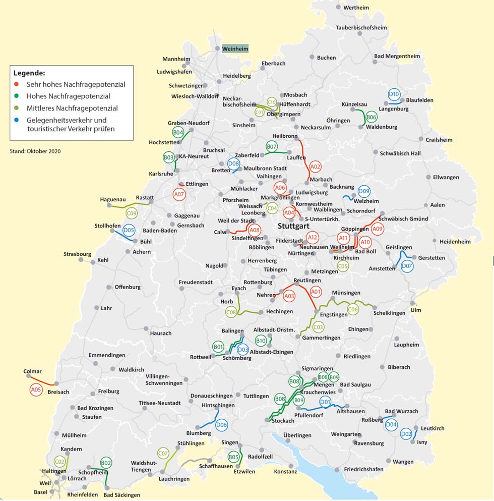 „Viele stillgelegte Bahnstrecken in Baden-Württemberg haben ein großes Fahrgastpo-tenzial. Das ist die Hauptbotschaft einer neuen Untersuchung“, sagte Verkehrsminis-ter Winfried Hermann bei der Vorstellung einer vergleichenden landesweiten Potenzi-aluntersuchung am Dienstag (03. November). Dazu wurden verschiedene kommu-nale und regionale Akteure sowie teilnehmende Verkehrsverbünde und Eisenbahnun-ter-nehmen zu einer Online-Veranstaltung eingeladen. Die Untersuchung zeigt, wel-che Bahnstrecken bzw. -korridore von einer Reaktivierung am meisten profitieren könnten. Zudem wurden mit neuen attraktiven Fördermöglichkeiten die Eckpunkte des Reaktivierungskonzepts des Landes vorgestellt. „In vielen der stillgelegten Bahnstrecken steckt ein beträchtliches Potenzial. Das wol-len wir heben“, sagte Minister Hermann und fügte hinzu: „Lassen Sie uns gemeinsam eine neue Reaktivierungsoffensive starten und dafür sorgen, dass viele Städte und Gemeinden wieder an die Schiene angebunden werden – in den Verdichtungsräumen aber auch im ländlichen Raum.“ Viele Strecken tragen auch zur Stärkung einer Re-gion und der Wirtschaft gerade in ländlich geprägten Räumen bei. Die Reaktivie-rungs-offensive ist ein wichtiger Beitrag zur Verkehrswende und zum Klimaschutz. Großes Fahrgastpotenzial auf vielen Strecken Insgesamt 42 stillgelegte Strecken im Land wurden durch das vergleichende Gutach-ten auf ihr Fahrgastpotenzial untersucht. Auf Grundlage des zu erwartenden Fahr-gastaufkommens wurden die Strecken in vier Kategorien eingeteilt (siehe Anlage). Ein sehr hohes Nachfragepotenzial von mehr als 1.500 Fahrgästen pro Schultag ist auf zwölf der untersuchten Strecken bzw. Schienenkorridoren zu erwarten, darunter die Echaztalbahn zwischen Reutlingen und Engstingen, die Bottwartalbahn zwischen Marbach (Neckar) und Heilbronn, die Markgröninger Bahn zwischen Ludwigsburg und Markgröningen und die Strecke Göppingen – Bad Boll – Kirchheim/Teck. Ein hohes Fahrgastaufkommen von 750 bis 1.500 Fahrgästen pro Schultag wird auf insgesamt zehn Strecken erwartet, darunter die Strecke Balingen – Rottweil, die Wehratalbahn zwischen Schopfheim und Bad Säckingen, die Kochertalbahn zwi-schen Waldenburg und Künzelsau, die Zabergäubahn zwischen Lauffen (Neckar) und Zaberfeld und die Ablachtalbahn zwischen Mengen und Stockach. Bei weiteren zehn Strecken ist ein mittleres Fahrgastaufkommen von 500 bis 750 Fahrgästen je Schul-tag zu erwarten, darunter die Krebsbachtalbahn zwischen Neckarbischofsheim und Hüffenhardt sowie die Kandertalbahn in Südbaden zwischen Haltingen und Kandern. Durch vertiefte Untersuchungen ist hier zu klären, ob ein höheres Nachfragepotenzial möglich ist. Dies kann im Rahmen einer Machbarkeitsstudie belegt werden. Für zehn Bahnstrecken mit weniger als 500 Fahrgästen je Schultag kommt das Gut-achten zu dem Schluss, dass für ein tägliches Angebot im Stundentakt nach den vor-liegenden Kenntnissen nicht genügend Fahrgäste erwartet werden. Hier kann im Ein-zelfall geprüft werden, ob die Strecken für ein verringertes Angebot, zum Beispiel für den Freizeit- und Museumsbahnverkehr geeignet sind. Förderung für Reaktivierungsvorhaben und Übernahme der Betriebskosten Minister Hermann betonte, dass die Rahmenbedingungen für neue Reaktivierungs-vorhaben so günstig sind wie noch nie und er ermutigte die im Livestream versam-melten kommunalen und regionalen Vertreterinnen und Vertreter, jetzt zügig konkrete Planungen voranzutreiben: „Der Bund fördert die Baukosten für Reaktivierungsvorha-ben neuerdings mit bis zu 90 Prozent. Das Land beteiligt sich zudem an den verblei-benden Kosten, so dass im Ergebnis Streckenreaktivierungen mit bis zu 96 Prozent der Baukosten gefördert werden können.“ Doch damit nicht genug: „Damit die Vorha-ben möglichst schnell durch die kommunalen Akteure geplant werden, wird das Land noch von diesem Jahr an bis Ende 2023 Machbarkeitsstudien zu Reaktivierungsvor-haben mit 75 Prozent fördern. Wichtig ist, dass die Akteure vor Ort sich möglichst frühzeitig auf ein gemeinsames Vorgehen abstimmen und die Streckenreaktivierun-gen vorantreiben.“ Darüber hinaus kündigte der Verkehrsminister an, dass das Land bei nachfragstarken Strecken grundsätzlich die Bestellung und die Kosten für den Betrieb der reaktivierten Bahnstrecken gemäß dem Landesstandard (mindestens Stundentakt, bei hoher Nachfrage mehr) übernehmen wird. Wird ein Angebot mit mehr Zügen als dem Lan-desstandard gewünscht, müsste der Teil des Angebots, der über den Landesstandard hinausgeht, kommunal finanziert werden. „Gerade auch um den ländlichen Raum zu stärken, übernimmt das Land bei Strecken mit einem Fahrgastpotenzial von mindes-tens 750 Fahrgästen je Schultag die Betriebskosten. Und bei Strecken mit einem mitt-leren Fahrgastpotenzial von 500 bis 750 Fahrgästen je Schultag bieten wir eine antei-lige Finanzierung der Betriebskosten in Höhe von 60 Prozent an.“ Die Vergabe der Mittel erfolgt in zeitlicher Reihenfolge der Inbetriebnahmen, sofern ausreichend Mittel vorhanden sind. „Durch diese Regelung besteht ein hoher Anreiz, zügig die notwendigen Planungen schnell in Angriff zu nehmen.“ Minister Hermann motivierte daher die lokalen und regionalen Akteure, jetzt aktiv zu werden: „Die Reak-tivierung von Schienenstrecken kann nur gemeinsam gelingen. Die Initiative muss von der kommunalen Ebene kommen. Als Land unterstützen wir die Projekte mit Rat und Tat und auch finanziell.“
