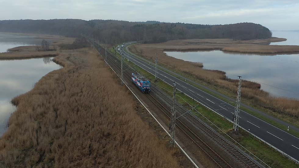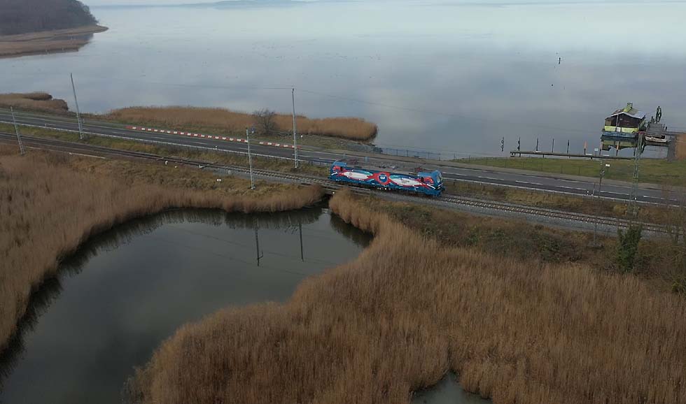 Harm Sievers, CEO Mukran Port Gruppe: „Mit dem neuen partnerschaftlichen Design unterstreichen wir die erfolgreiche Zusammenarbeit aller Beteiligten. Nach der sehr guten Entwicklung des letzten Jahres freut es uns sehr, den Standort Mukran sowie das Produkt der Zugverkehre zwischen Asien und Europa, unter Einbeziehung der Schiffspassage zwischen dem russischen Baltiysk und Mukran, durch das gemeinschaftliche Lokdesign, deutschland- und europaweit noch bekannter zu machen. Das positive Design spiegelt auch unser aller Erwartungen in der weiteren Etablierung dieses Produktes wider.“ Herr Kracht, Bürgermeister der Stadt Sassnitz: „Wir sind stolz auf die weitere Entwicklung des Fährhafen Sassnitz auf der neuen Seidenstraße. Die Seebrücke der Eisenbahn über die Ostsee ist ein weiterer Schritt zur Entwicklung des Mukran Ports und zur Schaffung neuer saisonunabhängiger Arbeitsplätze.“ „Mit dem neuen Design des Smartrons wollen wir ein Zeichen setzen. Ein Zeichen für das erfolgreiche Projekt der euen Seidenstraße. Was mit einem Probelauf letztes Jahr begann, hat sich schnell zu einem erfolgreichen Projekt entwickelt, welches immer weiterwächst. Es war an der Zeit, darauf auch mit einem partnerschaftlichen Lokdesign aufmerksam zu machen“, informiert Christian Becken, Projektleiter Intermodalverkehre bei der EGP. „Wir sind von unserem drachenstarken Design extrem begeistert und glauben, dass es auf den deutschen Bahnstrecken und den Hinterlandterminals für Aufsehen sorgen wird“, so Becken weiter. Unter der „Belt and Road Initiative“ startete im November 2019 der erste Probetransport auf der neuen alternativen Seidenstraße von Mukran nach Mannheim. Im Laufe des Jahres entwickelte sich das Projekt so gut, dass die Drehkreuzfunktion des Hafens Mukran weiter ausgebaut wurde. Neben den Verkehrsleistungen innerhalb Deutschlands, wird das Produkt mittlerweile auch direkt bis nach Rotterdam traktioniert. Die EGP erbringt die bahnseitigen Leistungen in Deutschland für die Mukran Port Gruppe. Zum Einsatz kommen nur die Elektro-Lokomotiven Smartron von Siemens. Diese ziehen die teilweise bis zu 740 Meter langen Züge, mit bis zu 50 mal 40-Fuß Containern, nicht nur schnell, sondern auch klimaschonend quer durch Deutschland und Europa. „Die Lok spiegelt wider, dass aus dem partnerschaftlichen Projekt der neuen Seidenstraßen über Mukran ein dauerhafter Regelverkehr entstanden ist. Gleichzeitig dient sie als Ansporn, die Qualität des Produktes hoch zu halten und weiter auszubauen. Wir freuen uns mit den starken Partnern EGP und der Mukran Port Gruppe an unserer Seite das Drehkreuz Mukran weiter zu entwickeln“, so Marcel Stein CEO, bahnoperator GmbH. Erste Ausfahrt der drachestarken Lok auf Rügen. (Mukran Port Terminals) Quelle:/Fotos: Eisenbahngesellschaft Potsdam mbH | |