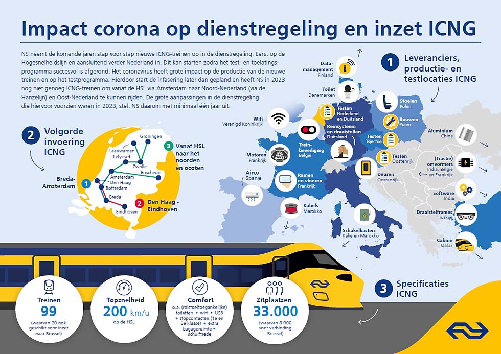 Die ersten ICNG-Züge befinden sich in den Niederlanden und führen jetzt landesweit Testfahrten durch. Wenn die Testfahrten positiv abgeschlossen werden, erwartet die NS, dass die ersten Passagiere Ende dieses Jahres an Bord gehen. Die Anzahl der Züge reicht jedoch nicht aus, um den gesamten Fahrplan im Jahr 2023 anbieten zu können. Die NS geht davon aus, dass dies frühestens 2024 der Fall sein wird. Zuvor werden die neuen Züge die fahrzeuge ersetzen, die auf der Hochgeschwindigkeitsstrecke zwischen Breda, Rotterdam, Amsterdam sowie zwischen Den Haag und Eindhoven verkehren. Die NS trifft diese Entscheidung jetzt, da Alstom, der französische Hersteller des Zuges, klargestellt hat, dass die globalen Auswirkungen von Corona einen großen Einfluss auf die Vorlaufzeit für die Entwicklung, den Bau, die Prüfung und die Genehmigung der ICNG-Züge haben. Reisebeschränkungen, Quarantänen und Verzögerungen bei der Lieferung von Teilen aus verschiedenen Teilen der Welt verlangsamen die Produktion. Darüber hinaus wurden Testläufe in Deutschland nach einem Unfall von zwei ICNG-Testzügen beim Abschleppen vorübergehend eingestellt. Vorhersehbarer und zuverlässiger Service Jantina Woudstra als Leiterin der Netzwerkentwicklung, verantwortlich für den Fahrplan bei NS: „Wir treffen diese Entscheidung nur ungern, aber auch aus der Überzeugung heraus, dass wir diese wichtigen Züge nicht unter Zeitdruck einführen wollen. Die Tatsache, dass Corona das ICNG-Programm jetzt verlangsamt, ist sehr ärgerlich, aber kein Grund, bei den Qualitätsanforderungen Kompromisse einzugehen. Wir passen den Zeitplan an, sobald wir fertig sind. Auf diese Weise können wir einen guten und vorhersehbaren Zeitplan anbieten. Davon profitiert der Reisende am meisten. “ Roel Okhuijsen, Direktor für neues rollendes Material bei NS, fügt hinzu: „Es ist immer ein aufregender Moment, einen neuen Zug einzuführen, der noch nie auf der niederländischen Strecke gefahren ist. Die Erfahrung hat gezeigt, dass es immer Kinderkrankheiten gibt. Durch umfangreiche Tests im Ausland und bei den niederländischen Eisenbahnen begrenzen wir Kinderkrankheiten, wenn der Zug in den Fahrplan aufgenommen wird. In den letzten Jahren hat NS viele neue SNG- und Flirt-Züge in seinen Fahrplan aufgenommen. Alle neuen Züge durchlaufen das gleiche umfassende Zulassungs- und Testprogramm. Dies gilt auch für ICNG. Auf diese Weise lernen wir unsere Züge gut kennen und können den Fahrplan so zuverlässig wie möglich gestalten. “ In den kommenden Jahren wird NS wesentliche Änderungen und Verbesserungen in den Zeitplan aufnehmen. Im Jahr 2022 verkehren an Wochentagen sechs Züge pro Stunde zwischen Schiphol und Rotterdam, zwischen Nimwegen und Schiphol sowie zwischen Dordrecht und Rotterdam. Anschließend wird NS in den kommenden Jahren schrittweise mit dem neuen, schnellen ICNG beginnen. Sobald das Testprogramm erfolgreich abgeschlossen wurde, werden die aktuellen Züge der HSL (ICR mit TRAXX-Lokomotive) schrittweise durch die ICNG ersetzt. Zuerst zwischen Amsterdam, Rotterdam und Breda und dann auf der Strecke zwischen Den Haag und Eindhoven. Nachdem dies abgeschlossen ist und der Zug eine gute Leistung erbringt, kann die Geschwindigkeit auf der HSL von 160 km / h auf 200 km / h angehoben werden. Sobald genügend Züge ausgeliefert und erfolgreich getestet wurden, kann das ICNG auch schrittweise auf den anderen Linien fahren: von der HSL über Amsterdam Süd über den Hanzelijn nach Groningen und Leeuwarden oder über Amsterdam Süd nach Amersfoort und Enschede. Auch der geplante Flughafensprinter zwischen Hoofddorp, Schiphol und Amsterdam Central wird mindestens ein Jahr später starten.