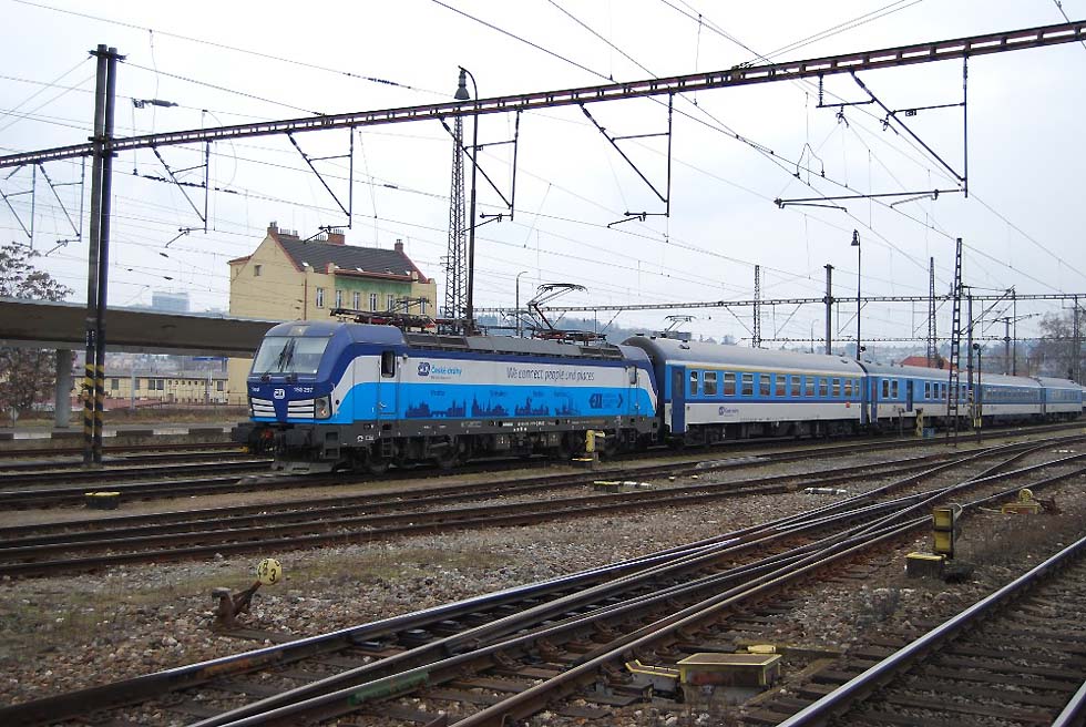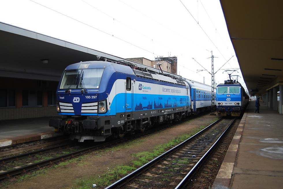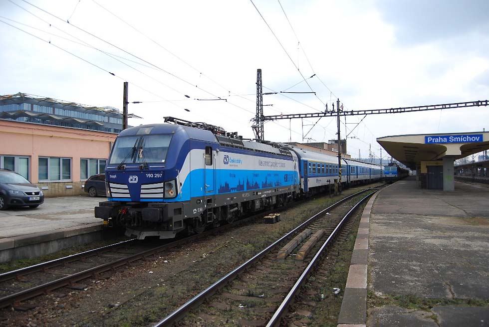 Für Personalschulung der Lokführer in Olomouc, Prerov und Ceska Trebova stellen bereits jetzt bis zu zwei Vectrons zur Verfügung. Die erste Vectron-Lok bei der CD (193 902) und einer der Vectrons, die regelmäßig nach Berlin und Hamburg fahren. Diese Lokomotiven fahren aktuell infolge der Covid-19-Pandemie nicht in vollem Betrieb nach Deutschland. Seit Februar fahren zwei Vectrons statt der Reihe 371 für Schulung auch an der Spitze von Zügen der Linie R18 'Slovacky expres' zwischen Praha und Stare Mesto u Uherskeho Hradiste, wo der Fahrdraht für diese Züge endet. Die Linie R 18 hat einen fünftägigen Umlaufplan für die BR 371, die mjit dem Vectron-Einsatz auf die Linie R 20 Labe Praha – Decín wechseln. Auf den Fotos von 10. März 2021 ist der Schnellzug 891 „Slovacky expres' von Praha nach Luhacovice im Bahnhof Praha-Smíchov mit der E-Lok 91 80 6193 297-9 D-ELOC von CD zu sehen.
