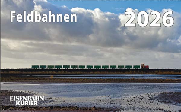 Feldbahnen 2026 Große Helfer auf kleiner Spur! Mit einer Spurweite von nur 600 mm gehören die Feldbahnen zu den kleinsten Eisenbahnen. Im Bergbau, in der Industrie, im öffentlichen Verkehr und in vielen anderen Einsatzgebieten sind sie immer noch weltweit unterwegs. Wir zeigen die kleinen, quirligen Bahnen sowohl im aktiven wie auch im Museumsbetrieb. 13 farbige Kalenderblätter auf Kunstdruckpapier,