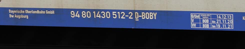09.02.2022 Daten ET 312 (BOB) .. 94 80 1430 512-2 D-BOBY6/Unt Stadler Velten 14.12.13V BOB bis 21.11.20VV BOB bis 19.11.21(aufgenommen 20.02.21) ... |