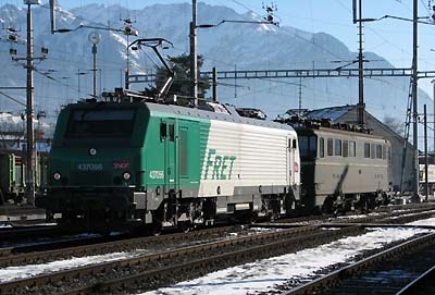 BB 437056 und eine geschleppte SBB Ae 6/6 als Last (SBB Cargo+SNCF FRET reichen sich die Kupplungen!)