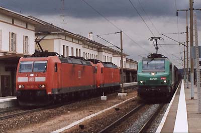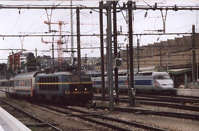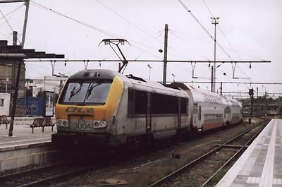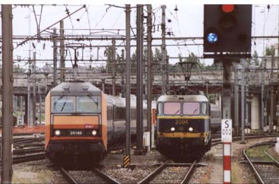 Während SNCB 2004 unter einem Teilstück Fahrdraht mit Gleichstrom wartet, kommt SNCF Sybic 26146 mit einem Eilzug aus Frankreich, der nach Belgien weiterlaufen soll.