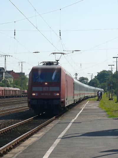 Um einen klaren Blick auf die umfangreichen Fotografen zu haben (oder vielleicht um zu verschleiern?) versprühte 101 033 mit IC 2012 aus Oberstdorf gleich Riesenfontainen zur Scheibenreinigung.