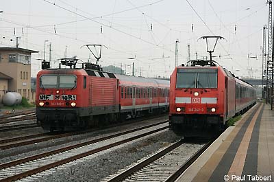 Nachdem ich dann einige Aufnahmen einer vernünftigen Lok, nämlich 143 923 gemacht habe, rollte dann mein RE nach Frankfurt a.M. Hbf, gezogen von 146 242. ein. Hier beide Loks nebeneinander.