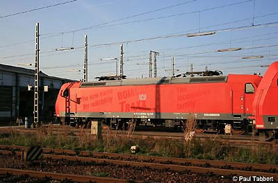 Auch die ausgeblichene Vorserienlok 185 002, die nun doch nicht von Railion oder DB Schenker Rail oder wie immer die mittlerweile auch heißen mögen an Bombarider zurückgegeben wurde, stand im Bw. Die entklebten Anschriften sind trotzdem noch sehr gut zu erkennen!