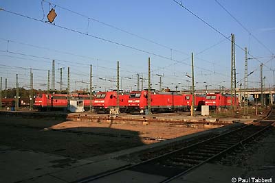 Hier ein Blick auf die Loks vor der Halle, v.l.n.r.: 151 043, 185 068, 002 und ganz rechts 185 223.
