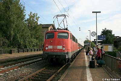 Voller Frust über die verpasste E94 fuhr ich weiter nach Friedrichsfeld. Dort klackerte 110 409 gerade mit der RB nach Heidelberg aus dem Bahnhof. Das ist übrigens mein erstes Bild einer 110 im regulären Regiodienst. Bisher hatte ich nur einige wenige Bahncharter-110er sowie 115er erwischt.