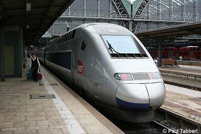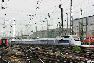 Der TGV machte sich dann auch wieder auf dem Weg, hier der Versuch, den ganzen Zug aufs Bild zu bekommen, lediglich die zwei Masten stören.
