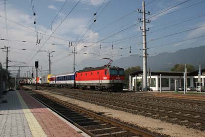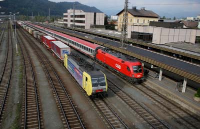 101 120 mit EC 89 begegnet 1216 033 die eine Rola schiebt im Bahnhof von St. Jodock