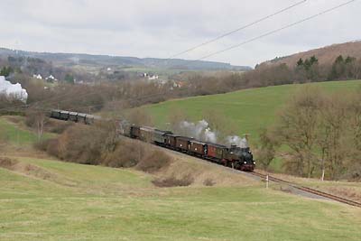 T 11 7512 bei Ulmen. Dieser Zug war aus zwei Dampfzügen gebildet. Am Zugende des T11 Zuges hing eine 263. Danach lief V 100 1091 und den Abschluss bildete 52 6106.