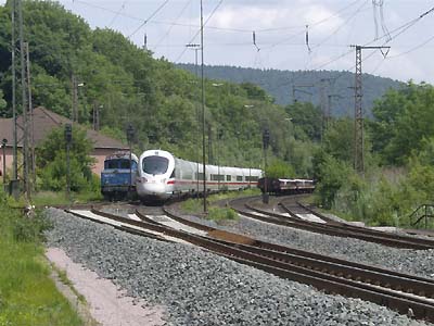 Da auf Gleis 1 auch bereits ein Güterzug auf Schub wartete, musste der aus Frankfurt nachfolgende ICE eigentlich auf dem für den Gegenverkehr vorgesehene Gleis 3 Durchgeleitet werden. Auf Gleis 4 wartet bereits 1020.41 um die Betonteile über den Berg zu schieben. Mit Gleiswechselbetrieb sind solche Situationen aber kein Problem.