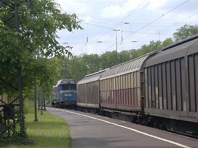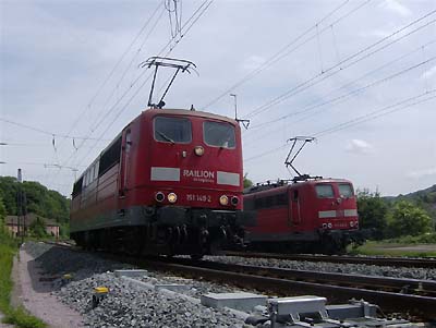 Die beiden Schubloks zeigten sich nebeneinander, als 151 149 gerade vom Berg zurückgekehrt an ihrer wartenden Schwester 151 014 vorbeirollte.