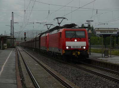 ...Doppeltraktion 189 034 + 189 030 mit einem Kohlezug Richtung Trier durch.