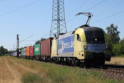 MRCE/boxXpress ES 64 U2-096 mit KLV-Zug bei Oftersheim in Richtung Karlsruhe.