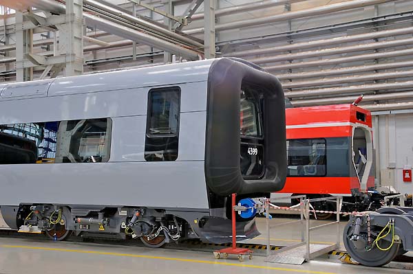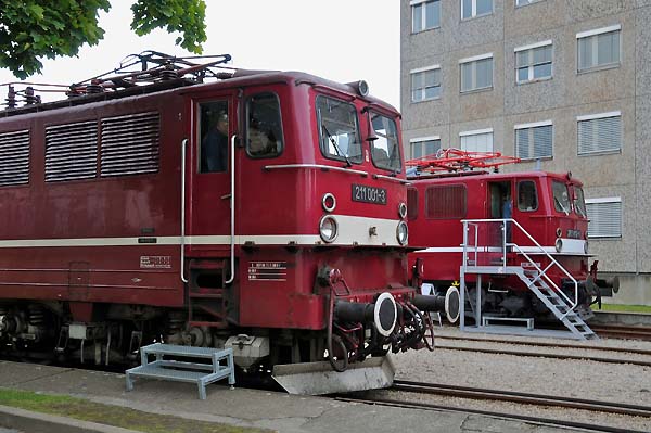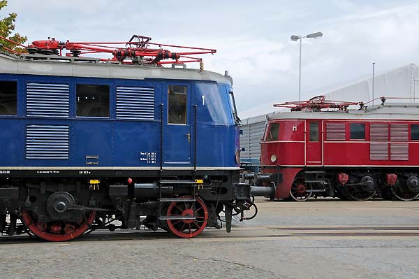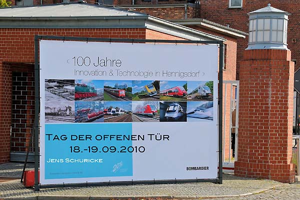 Die AEG hatte im Berliner Werk, in der Brunnenstraße, ihren Hauptsitz der Bahntechnik. Auf Grund der hohen Ausweitung des Eisenbahnsektors wurde diese Produktionsstätte immer unwirtschaftlicher und problematischer. Dadurch wurde es notwendig einen weiteren Standort zu errichten. Im Jahre 1910 hatte man nördlich von Berlin das Werk in Hennigsdorf gebaut. Das Bauwerk entstand nach den Vorgaben des AEG-Chefdesigner Peter Behrens. 1913 wurden die Fahrzeughallen für den Lokomotivbau fertig gestellt. Die AEG war an vielen Entwicklungen und Fertigungen des elektrischen Teils nahezu an fast allen deutschen elektrischen Lokomotivbaureihen beteiligt. Im Werk Hennigsdorf wurden viele Lokomotiven und Triebzüge weltweit gebaut, sowie neuere Technologien und Innovationen entwickelt. Die geschichtliche Veränderungen bedingt durch den zweiten Weltkrieg und die Teilung Deutschlands gab es schwierige Zeiten zu bewältigen. Die LEW Hennigsdorf wurde zum wichtigsten Lok-Hersteller der Deutschen Reichsbahn (DR), u.a. wurde im Werk die Neubaulokfamilie E11, E42 und E251 gebaut bis zur ihrer letzten Entwicklung der Baureihe 252, die als Nachfolger der Baureihe 250 (DB 155) vorgesehen war. Nach der Wiedervereinigung hieß das Werk wieder AEG und später durch die Übernahme des Daimler-Konzern Adtranz. In diesem Zeitraum wurde die Entwicklung der TRAXX-Familie ins Leben gerufen und die letztgebaute AEG-Lok die 12X mit der erstmaligen Anwendung eines modularen Systems hergestellt. Die wirtschaftliche Entwicklung des AEG-Konzerns führte im Jahre 1996 zur Auflösung einer langen technischen Tradition. Das Werk Hennigsdorf wurde vom Konzern Bombardier Transportation übernommen. 1997 verließ die letztgebaute Elektrolokomotive die Baureihe 145 010 Hennigsdorf und damit endet eine lange Lokomotivbau-Geschichte. Heute werden zum größten Teil Elektrotriebzüge, u.a. Talent 2 usw., entwickelt und hergestellt. Meine Bilderauswahl zeigt die Elektrolokomotiven der AEG-Baureihen E04, E18, E19, E44, E71 und E95; LEW-Baureihen E11, E251, E250 (DB 155), E243 (DB 143), Grubenlok BKK Bitterfeld und der Urvater der TRAXX-Familie 12X, sowie von Bombardier die Triebzüge Talent 2, Contessa, Iteno und außerdem waren an diesen Tagen zwei TRAXX-Loks 146 026 und 186 186 im Werk.