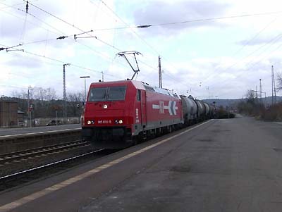 185 631 der HGK durchfährt von Süden kommend den Bahnhof Bebra mit kesselwagenzug.