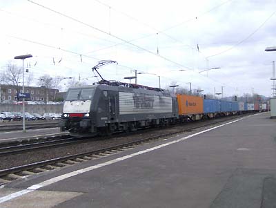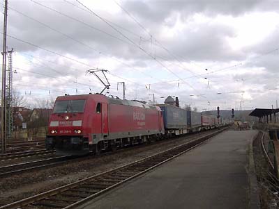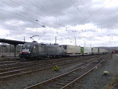 ES 64 F4 150 strebt mit Ihrem Containerzug Richtung Süden; ...