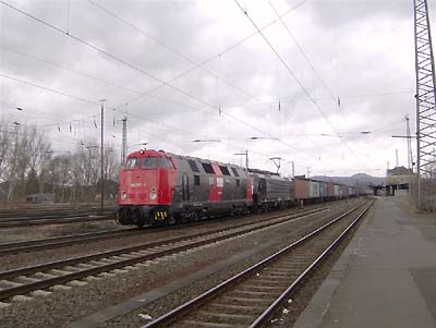 Bis dahin aber rollt eine sehr illustre Fuhre von Norden kommend durch den Bahnhof Bebra. Die schwarz/rote 228 757 als Vorspann vor einer schwarzen MRCE 189 (es müsste die ES 64 F4 082 sein) mit Containern Richtung Süden.