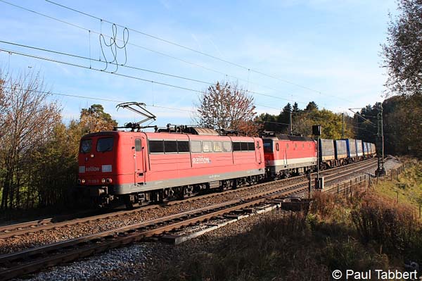 151 018 mit einer 1144 und einem KLV-Zug im Schlepp am 28.10.11 in Aßling