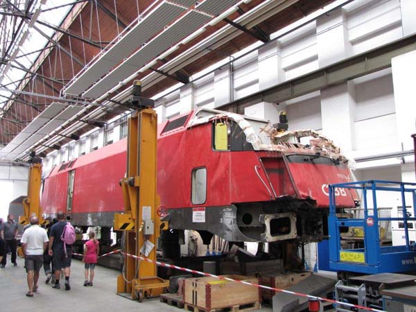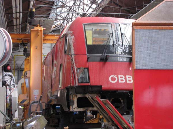 1116.075 (Unfall mit Bauzug in Linz) am 23.6.2012 im TS-Werk Linz