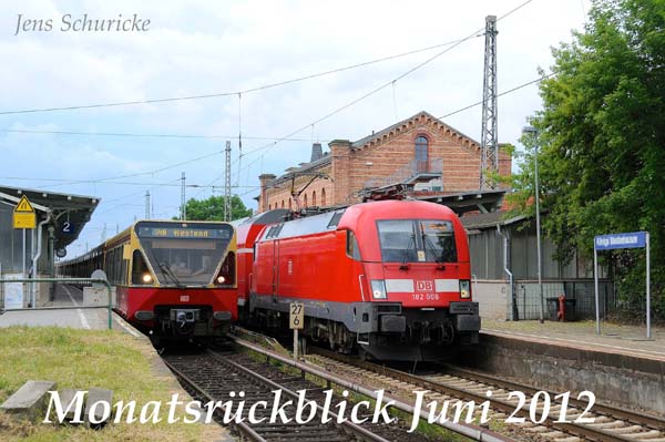 Gemeinsam verlassen die DB-Regiolok 182 008 (Siemens 20305/2001) mit dem RE2 (Cottbus-Wismar) und die Berliner S-Bahn 480 067 (AEG 36195/1994) S46 nach Westend den Bahnhof Königs Wusterhausen