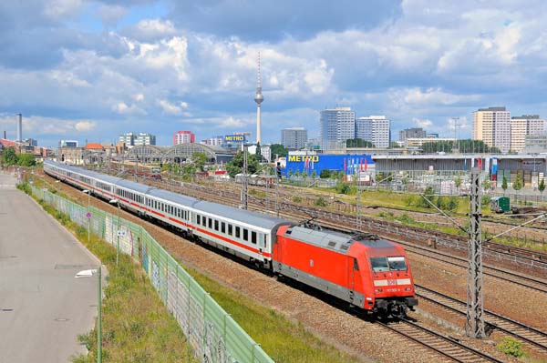 Die DB-Fernverkehrslok 101 052 (Adtranz 33162/1996) verlässt mit dem Leerpark-Intercity den Berliner Ostbahnhof und wird in einigen Minuten später das Betriebswerk Rummelsburg erreichen