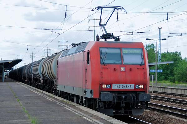 Die DB-Schenkerlok 145 048 (Adtranz 33367/1999) fuhr mit dem Kesselzug durch Schönefeld in Richtung Grünauer Kreuz und dann weiter gen Norden zum Zielbahnhof PCK Raffinerie in Schwedt