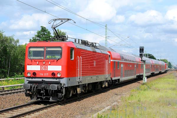 Das DB-Regio-Sandwich 114 017 (LEW Hennigsdorf 21310/1991) und am Zugende die 112 187 (AEG 21559/1994) erreichte mit dem RE4 (Ludwigsfelde-Rathenow) den Berliner Bahnhof Jungfernheide