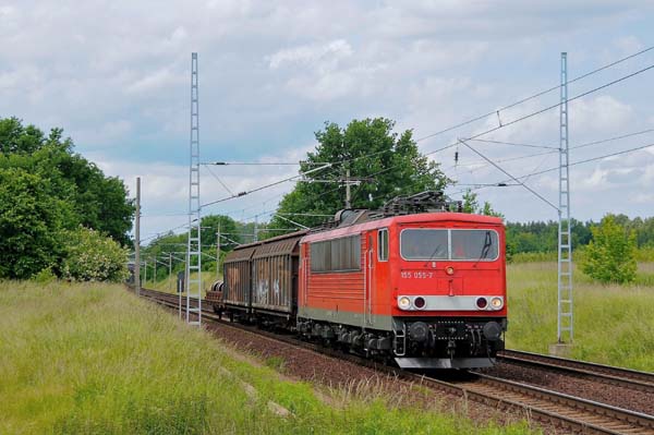 Ob die Güterzuglok der Baureihe 155, die 155 055 (LEW Hennigsdorf 15506/1978) mit dieser Güterleistung überfordert war ? Sie fuhr mit dem Mini-Güterzug über den westlichen Außenring und kam durch das brandenburgische Örtchen Marquardt