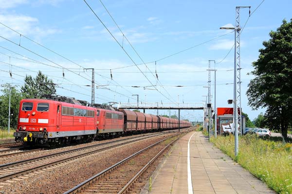 Die beiden AK-151ziger die 151 104 (Henschel 31880/1975) und die 151 110 (Henschel 31886/1975) sind mit dem leeren Erzbomber aus Ziltendorf in Richtung Hamburg-Waltershof unterwegs und fuhren am Nachmittag über den südlichen Außenring durch Saarmund