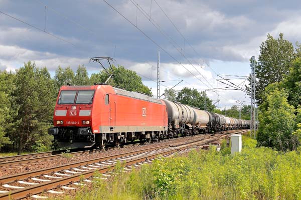 Ab durch die legendäre Berliner Wuhlheide fuhr die DB-Traxxlok 185 064 (Bombardier 33479/2002) mit dem Kesselzug in Richtung Biesdorfer Kreuz