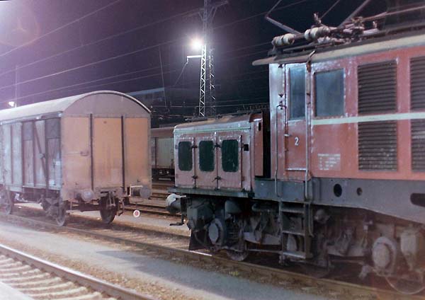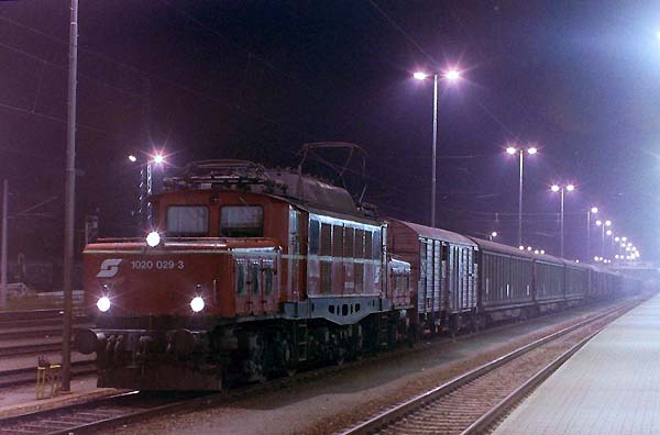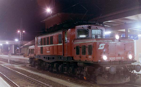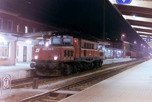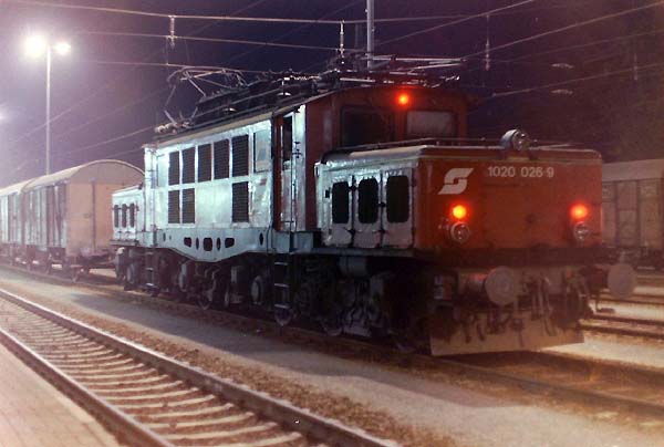 Am nächsten Tag sollte es für mich wieder nach Hause gehen, und so fasste ich den Entschluß, abends noch mal mit Stativ loszuziehen, um ein paar Nachtaufnahmen zu machen. Es war mächtig warm, und mit Wetterleuchten kündigte sich ein Unwetter an. Doch ich hatte Glück: in Arnoldstein standen E94, und es blieb trocken! 1020.026 wartete am Hausbahnsteig auf neue Aufgaben.