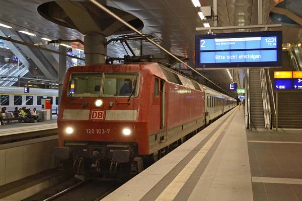 Die 120 103 brachte den Lr des EC 46 aus Warschau in die Abstellung.