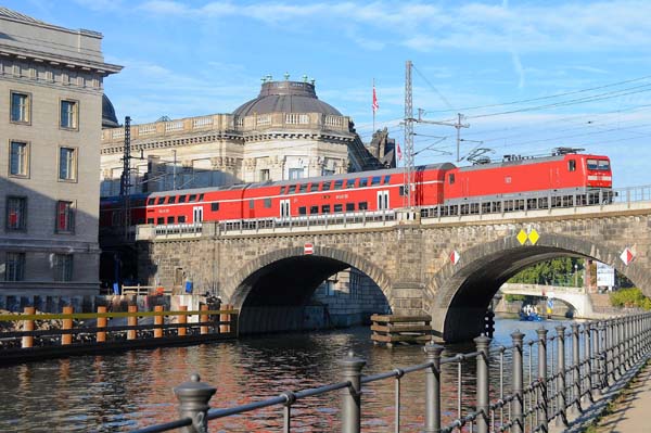 Früh morgens überquerte die DB Regio-Lok 112 165 mit dem RE1 an der Berliner Museumsinsel die Spree und wird in wenigen Minuten den Bahnhof Alexanderplatz erreichen