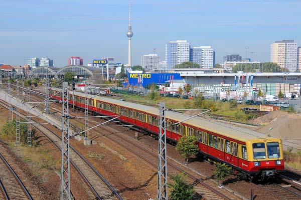 Die S-Bahnbaureihe 485 068 als S5 (Westkreuz-Hoppegarten) eingesetzt, erreicht gleich den S-Bahnhof Warschauer Straße
