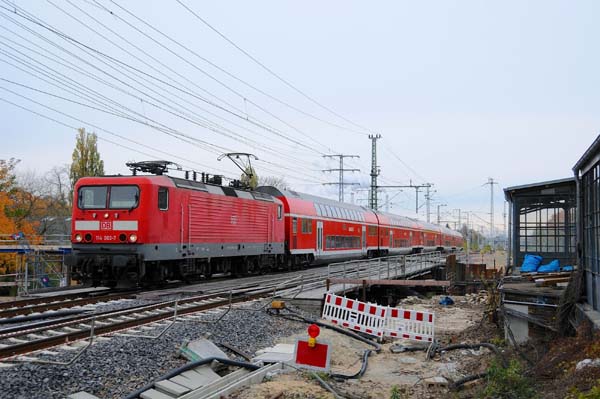 Die DB Regio-Lok 114 003 fuhr vormittags mit dem RE1 an der Baustelle bei Berlin-Karlshorst, Brückenerneuerung, vorbei in Richtung Köpenick