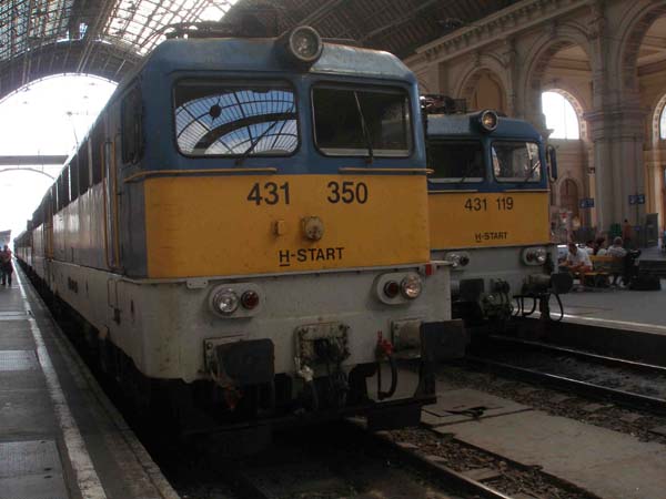 MAV 431 350 und 431 119 sind im Bahnhof Budapest Keleti angekommen und stehen nun in der Bahnhofshalle.